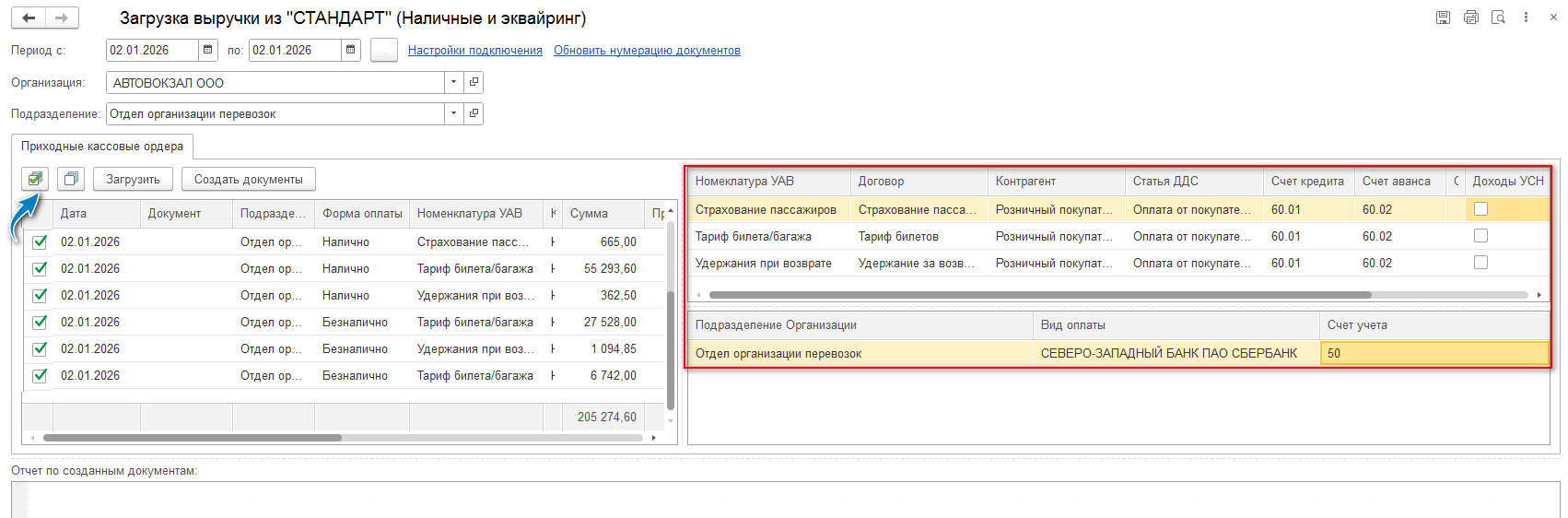 Соответственно, при загрузке в "1С:Бухгалтерия", будут сформированы документы "Поступление наличных" и "Операция по платежной карте".