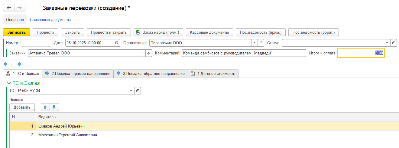 Для водителя необходимо распечатать заказ-наряд в трех экземплярах, а так же посадочную ведомость. Обе печатные формы находятся в шапке документа.