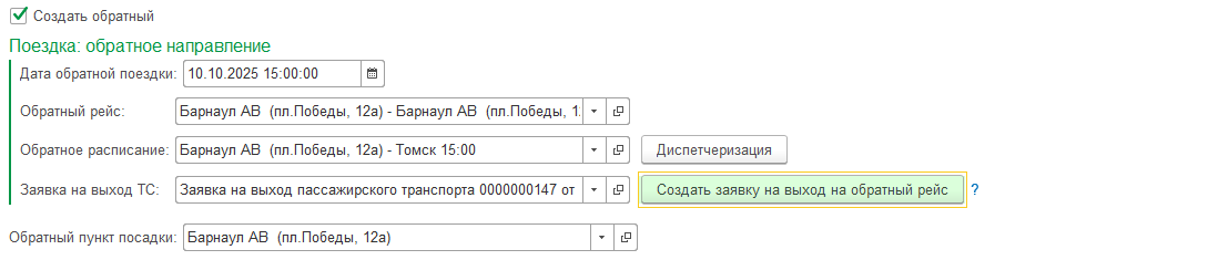 Рейс и расписание будут созданы автоматически. Обратный пункт посадки будет соответствовать начальному пункту убытия для обратного рейса. При необходимости пункт может быть изменен на промежуточный пункт из этого рейса.