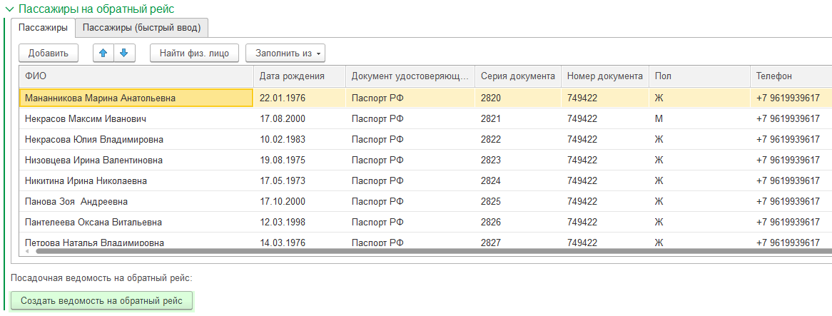 После заполнения списка пассажиров нажмите кнопку "Создать ведомость на обратный рейс".