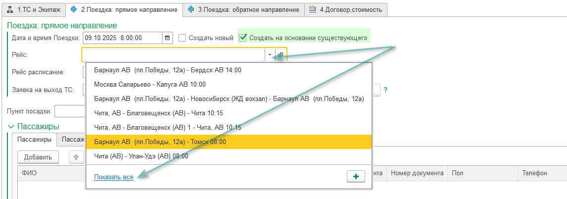 Укажите дату и время Поездки, установите отметку на "Создать на основании существующего". Из выпадающего списка выберите нужный рейс. Чтобы увидеть полный список рейсов нажмите ссылку "Показать все".