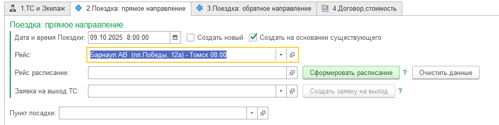 Часть 2. Создание рейса на основании существующего в прямом направлении