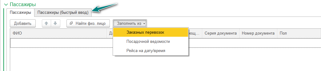 Например, если данные пассажиры уже совершали поездки тем же составом, то можно выбрать предыдущий документ "Заказные перевозки", "Посадочная ведомость" или выбрать из числа пассажиров регулярного рейса.