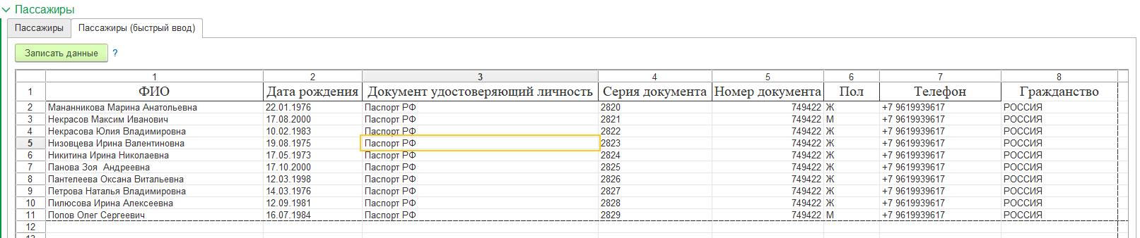 Проверьте сведения, если все корректно, нажмите кнопку "Записать данные" и переключитесь на вкладку "Пассажиры".