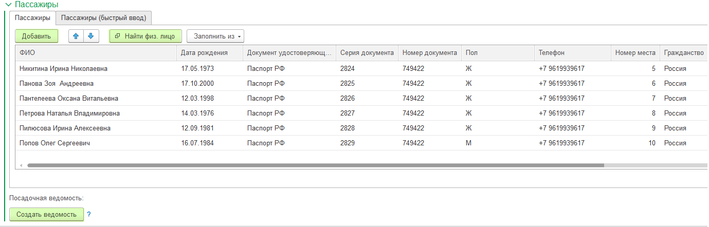 Таблица с пассажирами заполнена, назначены посадочные места.