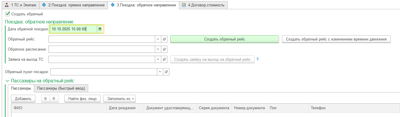 В табличной части укажите дату и время обратной поездки. Нажмите кнопку "Создать обратный рейс".
