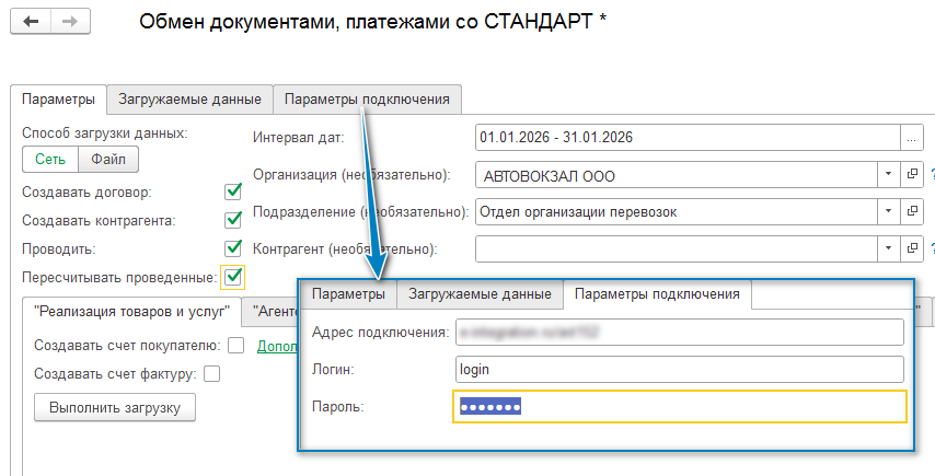 2. Настройка параметров подключения для обработки "Обмен документами, платежами со СТАНДАРТ".