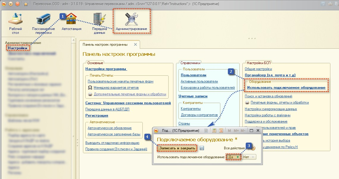 2) Вводим настройки кассового оборудования (настройки кассового оборудования берём из уставновленного на компьютер драйвера).