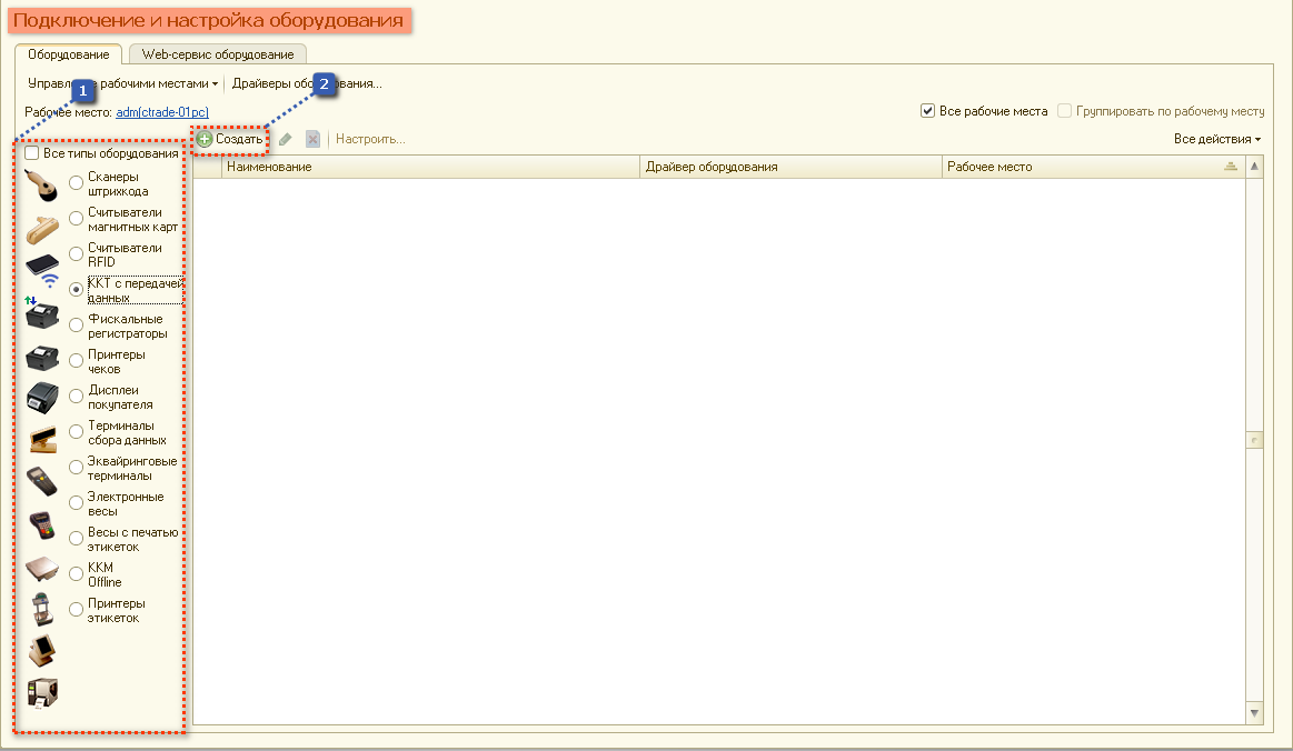 ВАЖНО!!! Тип выбираем в зависимости от оборудования, может быть либо "Фискальные регистраторы", либо "ККТ с передаче данных".