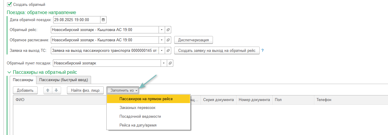 После заполнения списка пассажиров нажмите кнопку "Создать ведомость на обратный рейс".