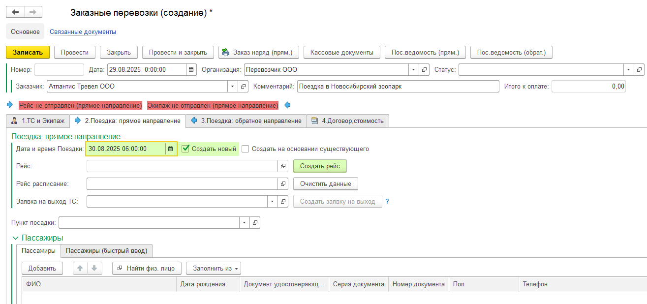 Меню Заказные перевозки - Документы - Заказные перевозки - Создать