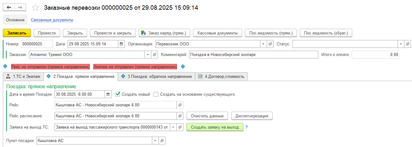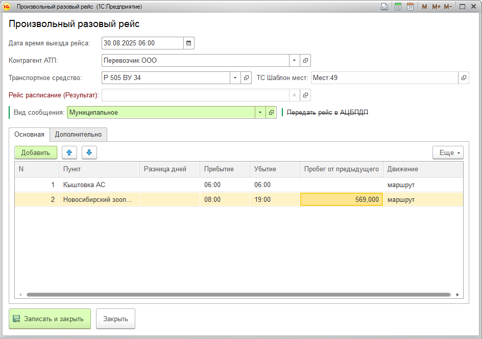 Рейс и расписание будут созданы автоматически. Обратный пункт посадки будет соответствовать начальному пункту убытия для обратного рейса. При необходимости пункт может быть изменен на промежуточный пункт из этого рейса.