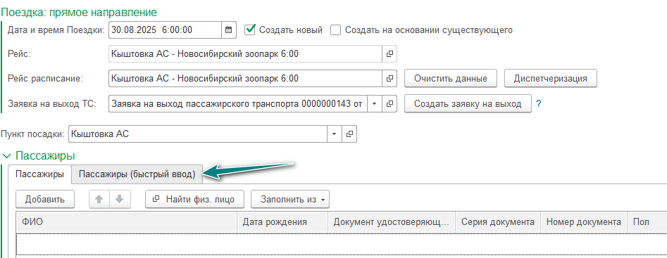 Например, если данные пассажиры уже совершали поездки тем же составом, то можно выбрать предыдущий документ "Заказные перевозки", "Посадочная ведомость" или выбрать из числа пассажиров регулярного рейса.