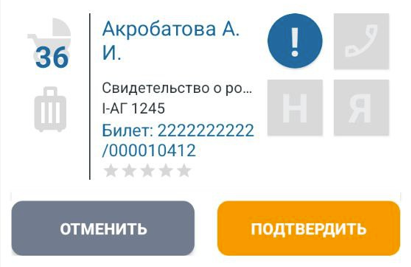 В списке видны ФИО пассажира, сведения о документе удостоверяющем личность. Если по пассажиру имеется дополнительная информация от диспетчера/кассира, то кнопка информация будет подсвечена красным цветом. Также из этого раздела Вы можете позвонить пассажиру, если при покупке билета был указан его номер телефона.