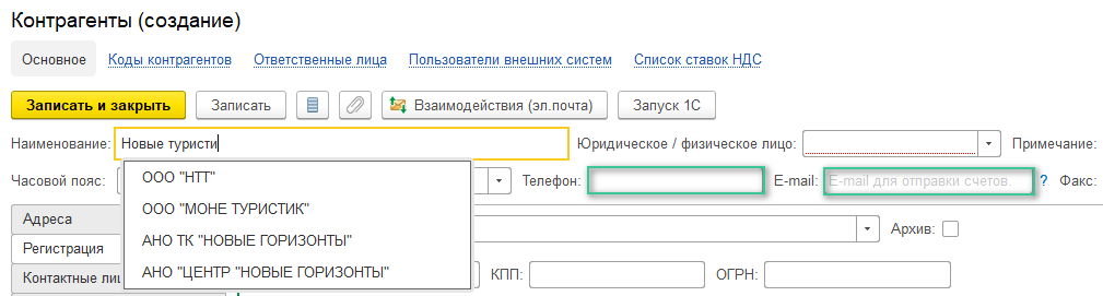 В строке Наименование впишите название контрагента или его ИНН, система подберет доступные сведения. Выберите нужного контрагента, большинство полей в форме будет заполнено автоматически. Обязательно проверьте эти сведения на корректность.