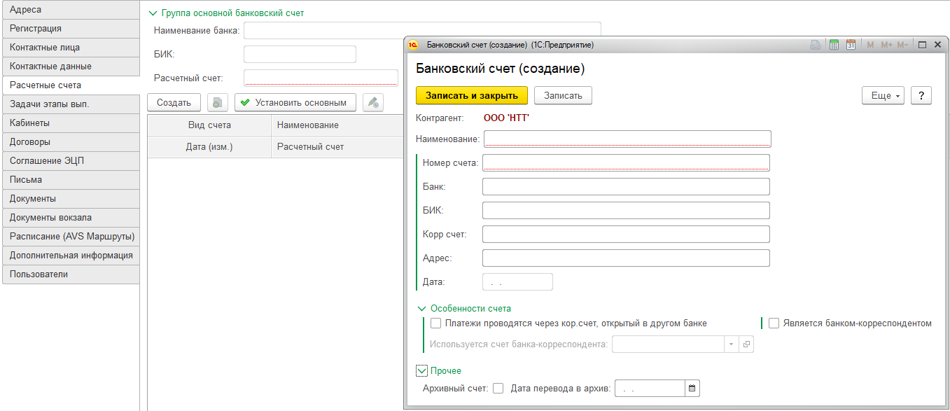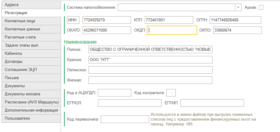 Если партнер не является перевозчиком и сведений по нему невозможно получить из системы "E-вокзал", то необходимо завести для него карточку вручную.