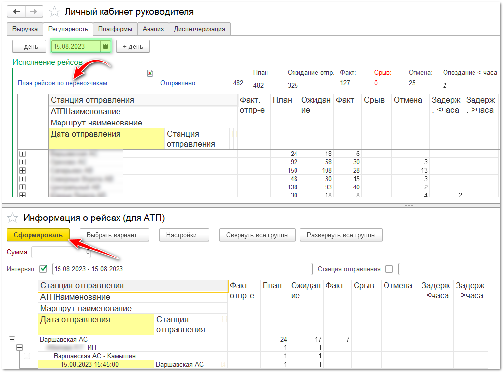 Данный отчет показывает рейсы по станциям на выбранный день: запланированные, ожидаемые к выходу, фактически вышедшие, отмененные, сорванные и те, которые отправляются с задержкой. Подробный отчет по рейсам конкретного перевозчика можно просмотреть, нажав на ссылку План рейсов по перевозчикам.