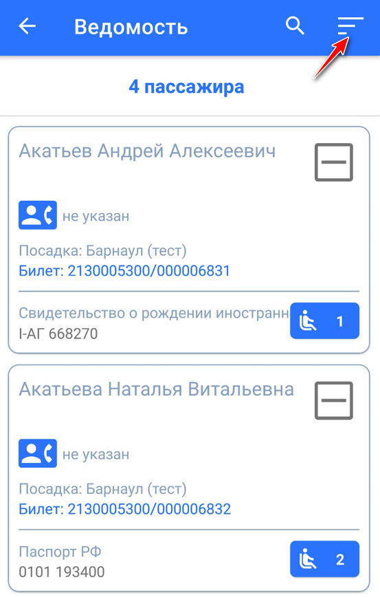 Все пассажиры могут быть отсортированы либо по посадочному месту в автобусе, либо по пункту посадки, независимо от даты и места приобретения билета.