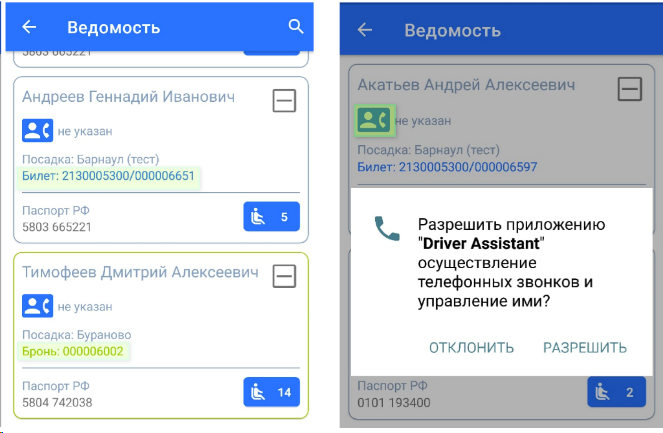 Из ведомости есть возможность позвонить пассажиру, для этого нужно нажать кнопку вызова. При нажатии на карточку пассажира можно также выставить рейтинг пассажира, написать комментарий.